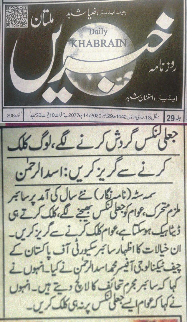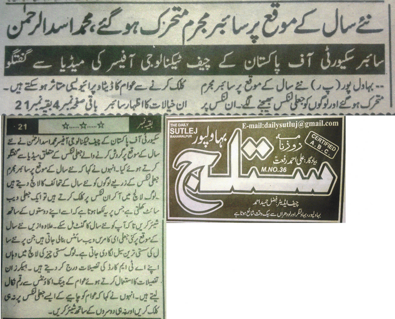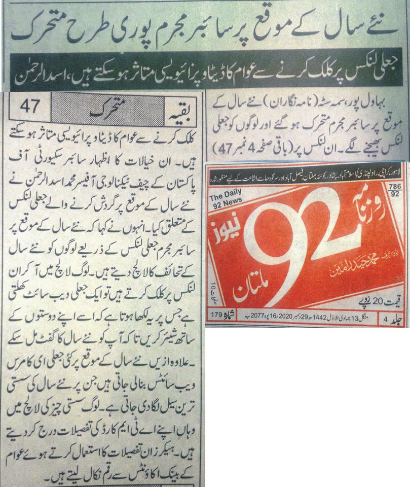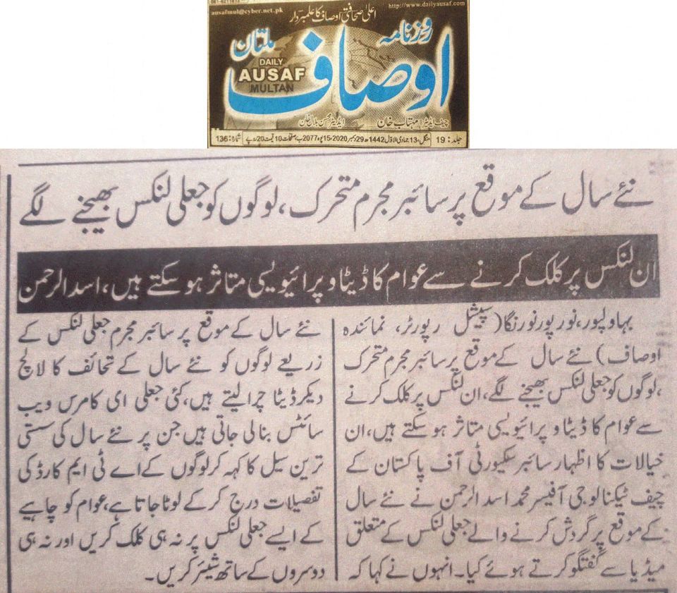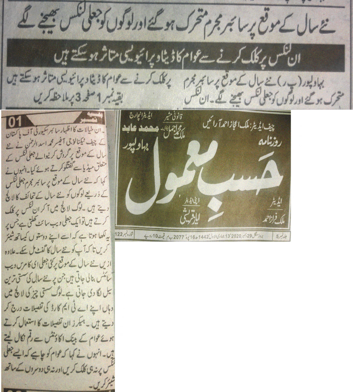 نئے سال کے موقع پر سائبر مجرم متحرک ہو گئے اور لوگوں کو جعلی لنکس بھیجنے لگے۔ ان لنکس پر کلک کرنے سے عوام کا ڈیٹا و پرائیویسی متاثر ہو سکتے ہیں۔ ان خیالات کا اظہار سائبر سکیورٹی آف پاکستان کے چیف ٹیکنالوجی آفیسر محمداسدالرحمن نے نئے سال کے موقع پر گردش کرنے والے جعلی لنکس کے متعلق میڈیا سے گفتگو کرتے ہوئے کیا۔