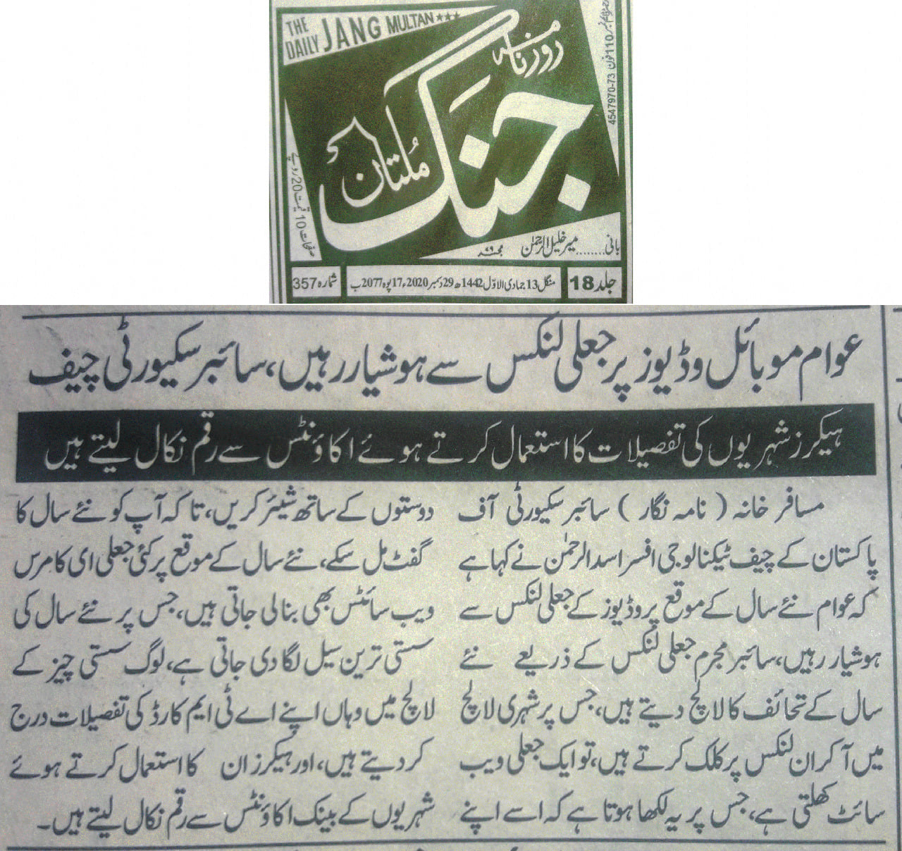 انہوں نے کہا کہ نئے سال کے موقع پر سائبر مجرم جعلی لنکس کے زریعے لوگوں کو نئے سال کے تحائف کا لالچ دیتے ہیں۔لوگ لالچ میں آکر ان لنکس پر کلک کرتے ہیں تو ایک جعلی ویب سائٹ کھلتی ہے جس پر یہ لکھا ہوتا ہے کہ اسے اپنے دوستو ں کے ساتھ شیئر کریں تا کہ آپ کو نئے سال کا گفٹ مل سکے۔