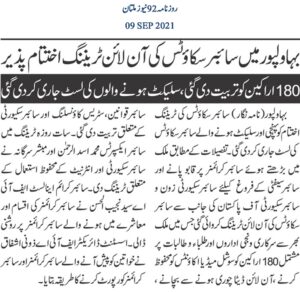 سائبر سکاؤٹس کی ٹریننگ اختتام کو پہنچی اور سلیکٹ ہونے والے سائبر سکاؤٹس کی لسٹ جاری کر دی گئی۔ تفصیلات کے مطابق ملک میں بڑھتے ہوئے سائبر کرائمز پر قابو پانے اور سائبر سیفٹی کے فروغ کے لیے سائبر سکیورٹی زون و سائبر سکیورٹی آف پاکستان کی جانب سے سائبر سکاؤٹس کی آن لائن ٹریننگ کروائی گئی جس میں ملک بھر سے سرکاری و نجی اداروں اورطلباء و طالبات پر مشتمل 180 اراکین کو سوشل میڈیا اکاؤنٹس کو محفوظ کرنے،آن لائن ڈیٹا چوری ہونے سے بچانے، سائبر قوانین، سٹریس کاؤنسلنگ اور سائبر سکیورٹی کے متعلق تربیت دی گئی۔