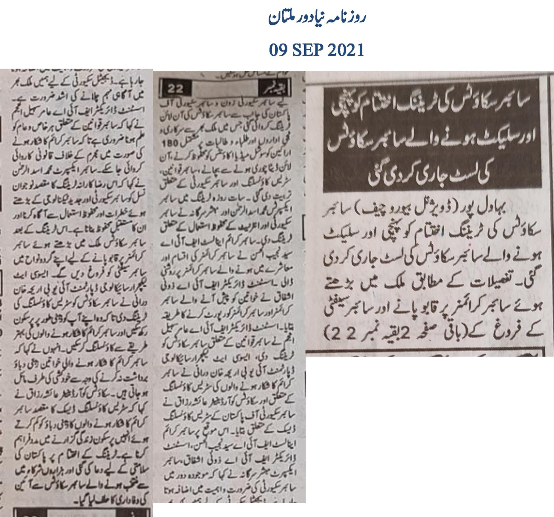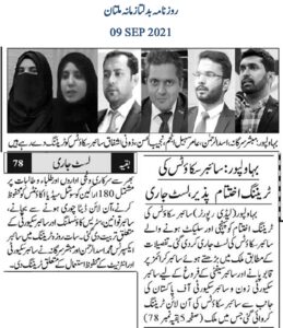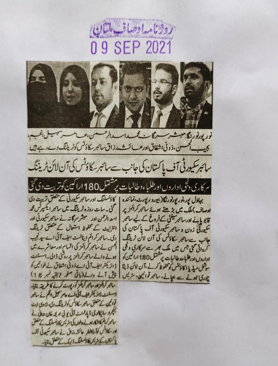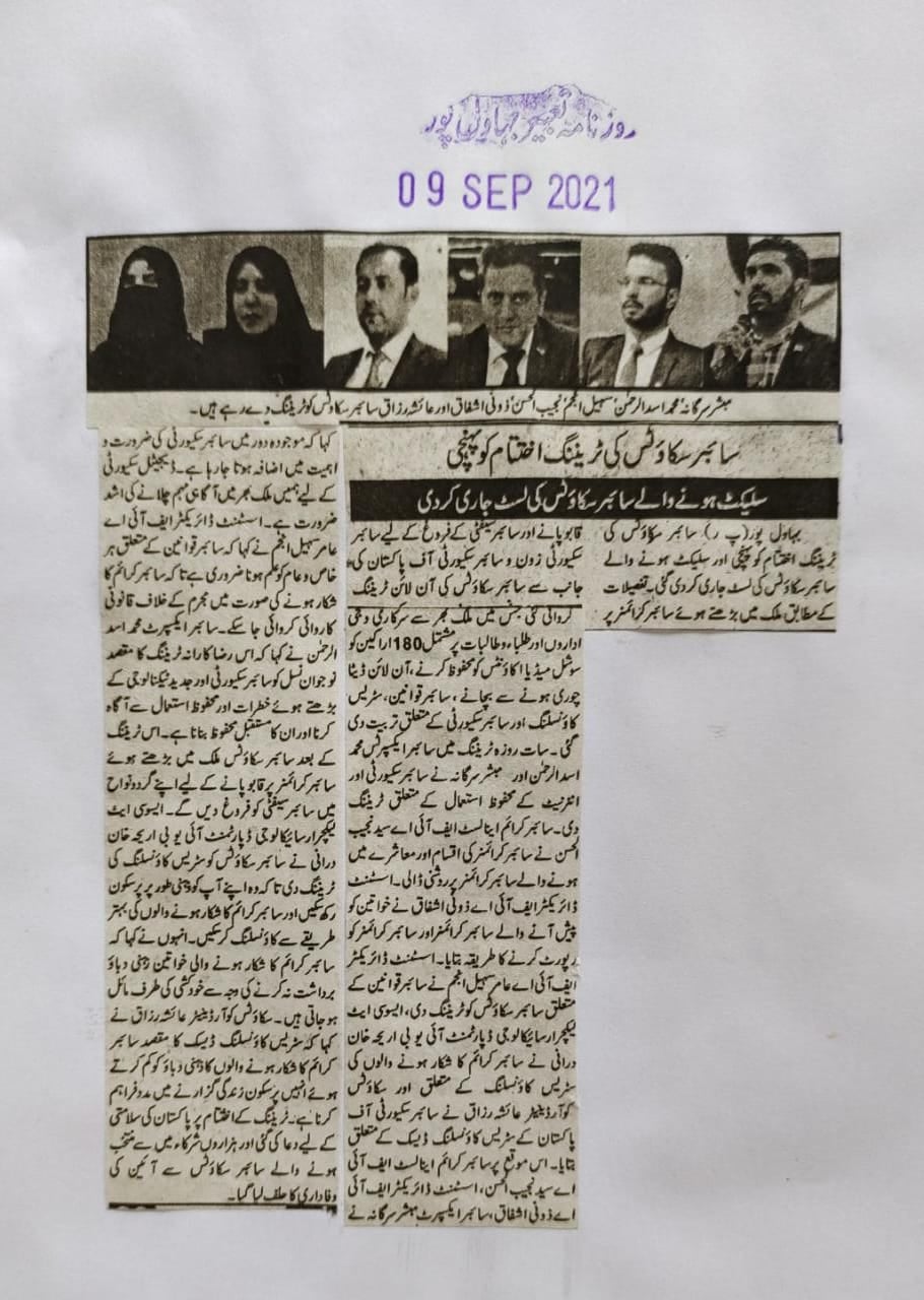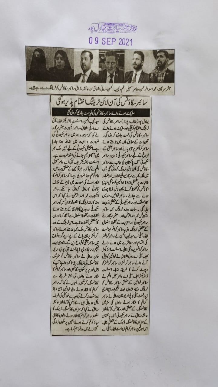 سات روزہ ٹریننگ میں سائبر ایکسپرٹس محمد اسد الرحمن اور مبشر سرگانہ نے سائبر سکیورٹی اور انٹرنیٹ کے محفوظ استعمال کے متعلق ٹریننگ دی۔سائبر کرائم اینالسٹ ایف آئی اے سید نجیب الحسن نے سائبر کرائمز کی اقسام اور معاشرے میں ہونے والے سائبر کرائمز پر روشنی ڈالی۔اسسٹنٹ ڈائریکٹر ایف آئی اے ذونی اشفاق نے خواتین کو پیش آنے والے سائبر کرائمزاور سائبر کرائمز کو رپورٹ کرنے کا طریقہ بتایا۔