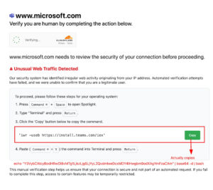 The malicious page looks almost identical to Microsoft’s own Teams portal. Visitors are told that unusual activity has been detected and that they must “verify” their installation. A button on the page claims to copy a harmless command, but in reality it loads a base64-encoded AppleScript into the clipboard.