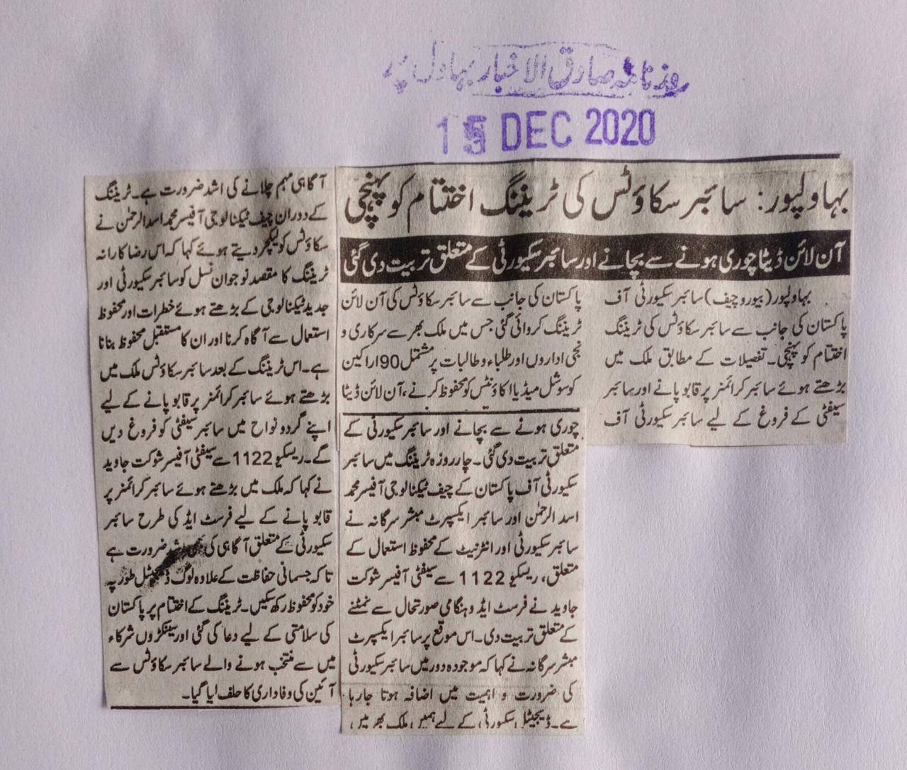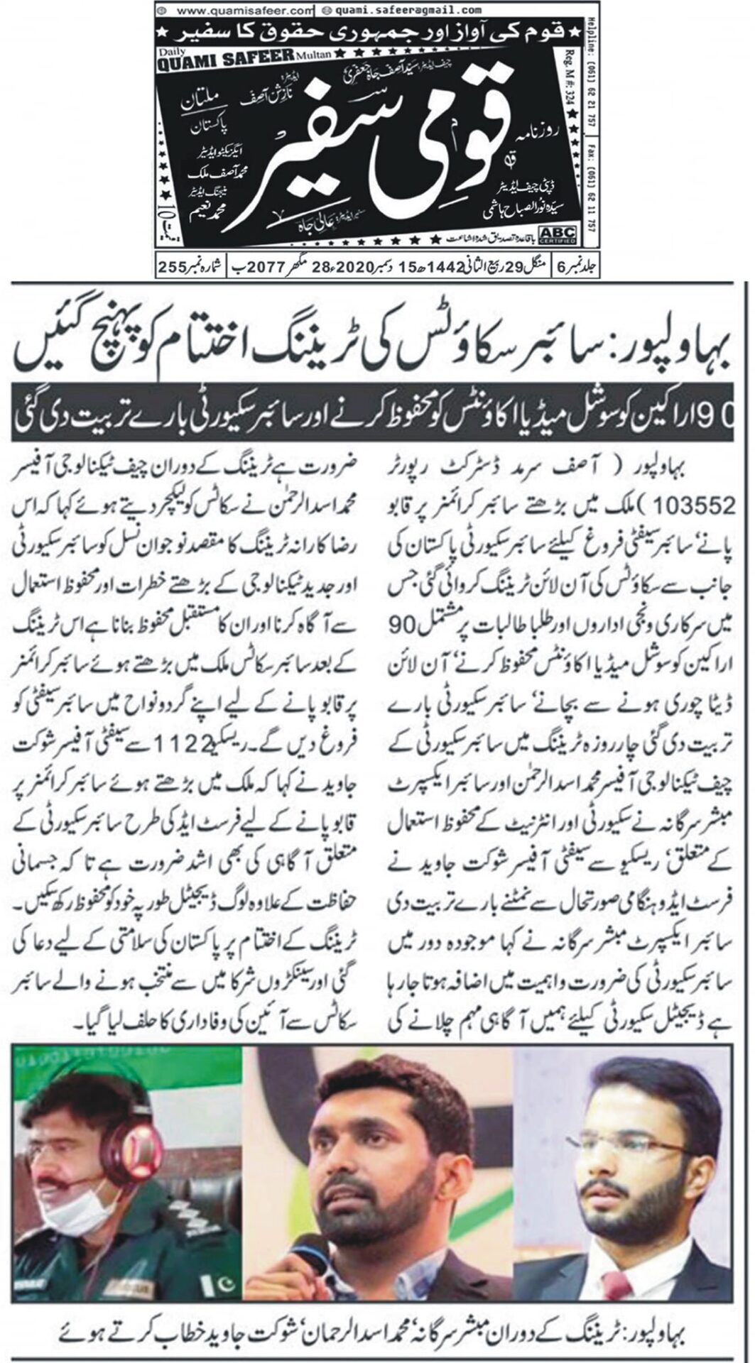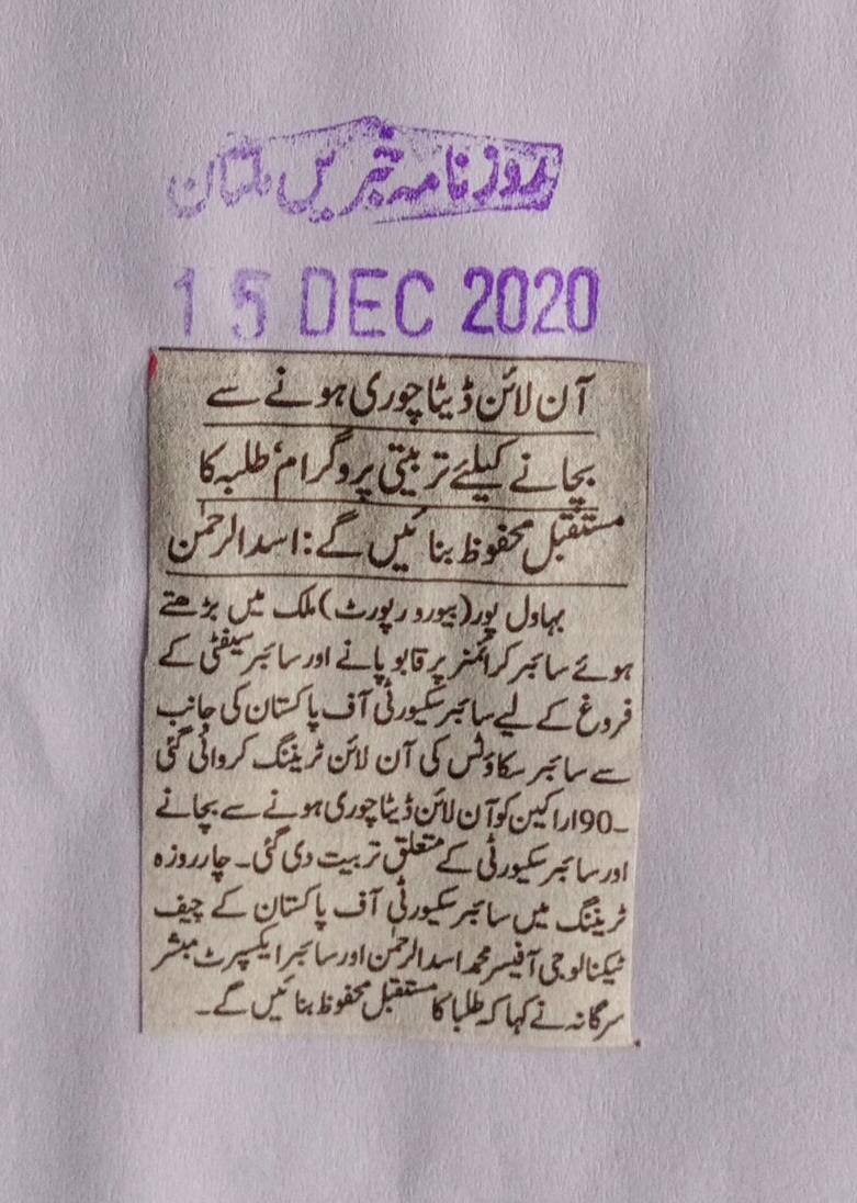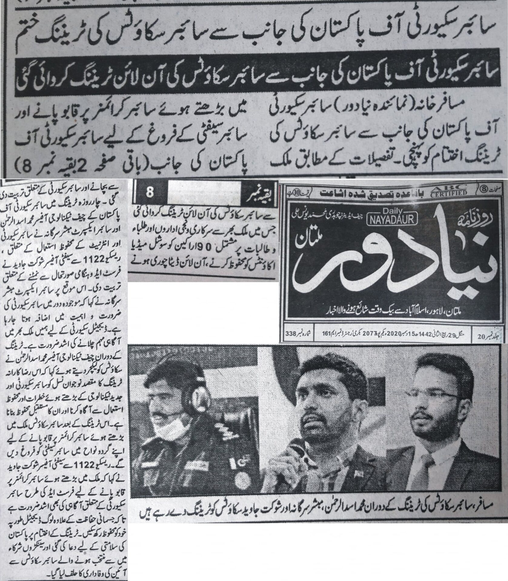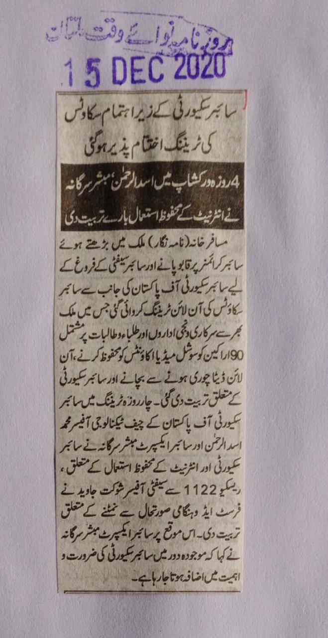 During the four-day training, Muhammad Asad Ul Rehman, Chief Technology Officer of Cyber Security of Pakistan, and cyber expert Mubashir Sargana provided guidance on cyber security and safe internet usage. Additionally, Shaukat Javed, a safety officer from Rescue 1122, provided training on first aid and handling emergency situations.