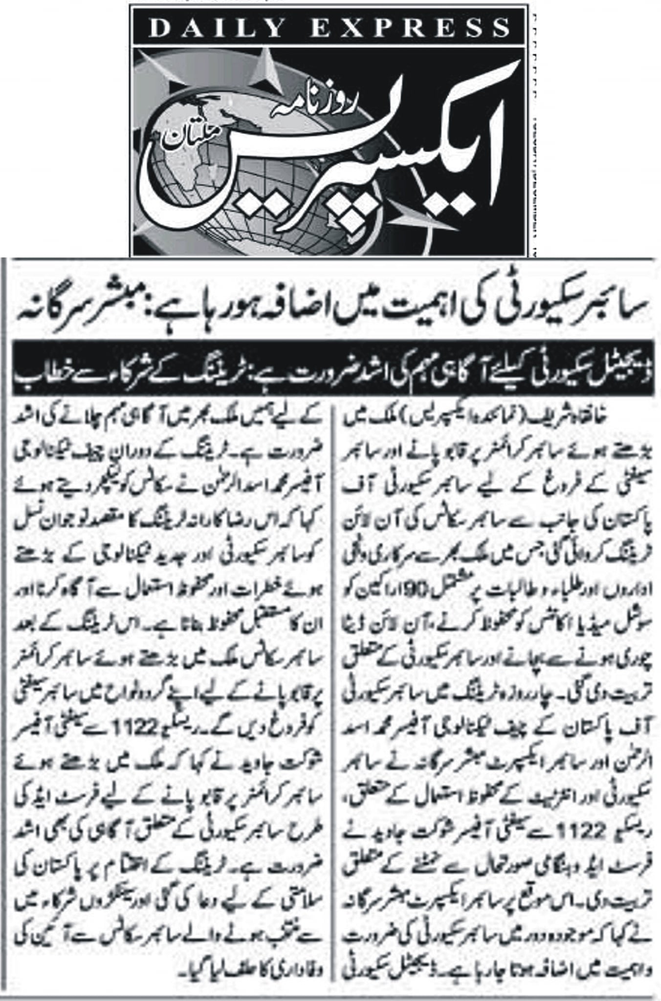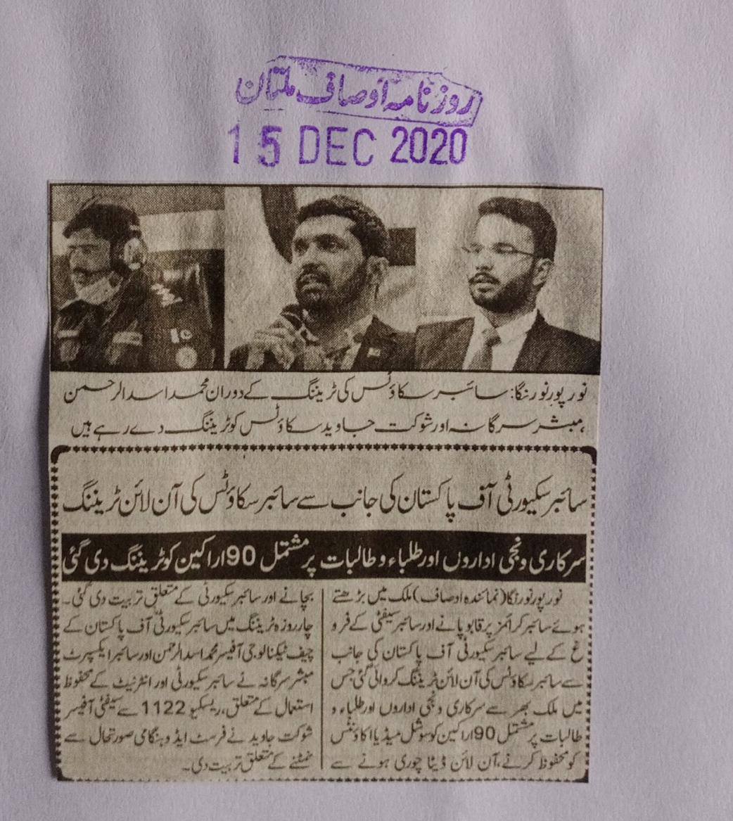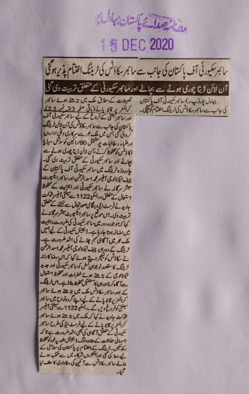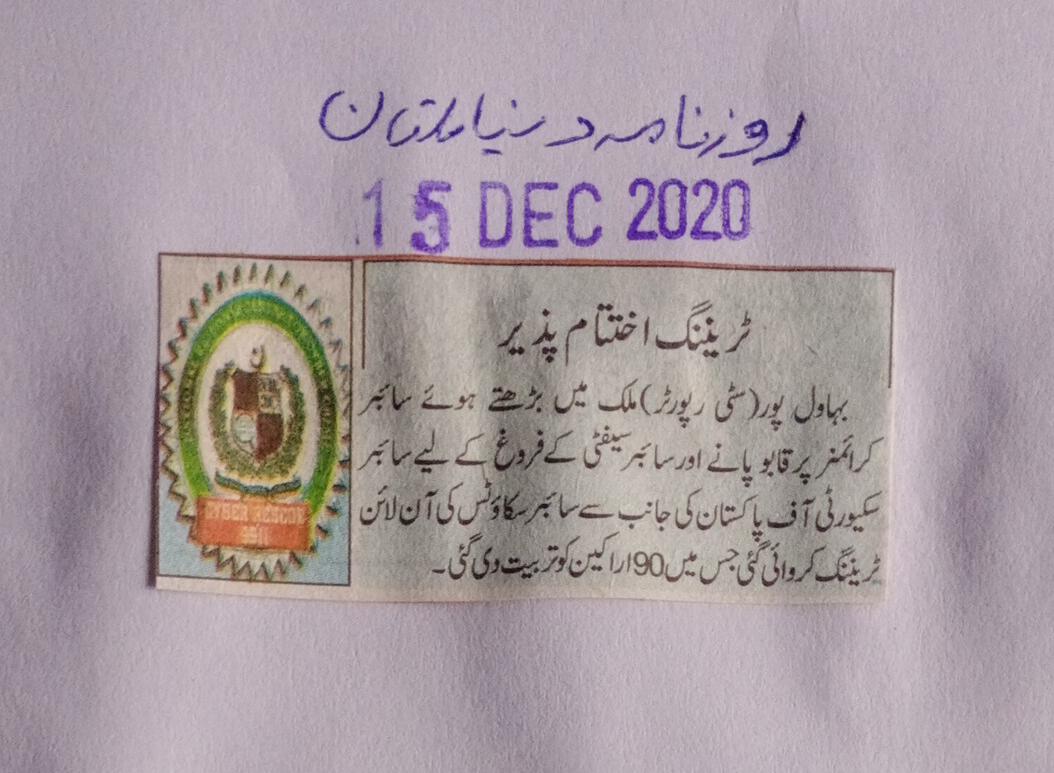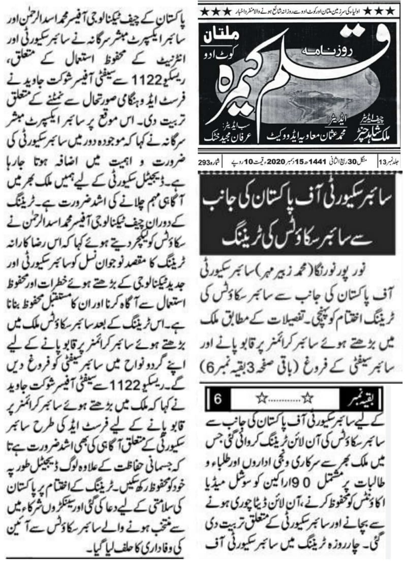 During the four-day training, Muhammad Asad Ul Rehman, Chief Technology Officer of Cyber Security of Pakistan, and cyber expert Mubashir Sargana provided guidance on cyber security and safe internet usage. Additionally, Shaukat Javed, a safety officer from Rescue 1122, provided training on first aid and handling emergency situations.