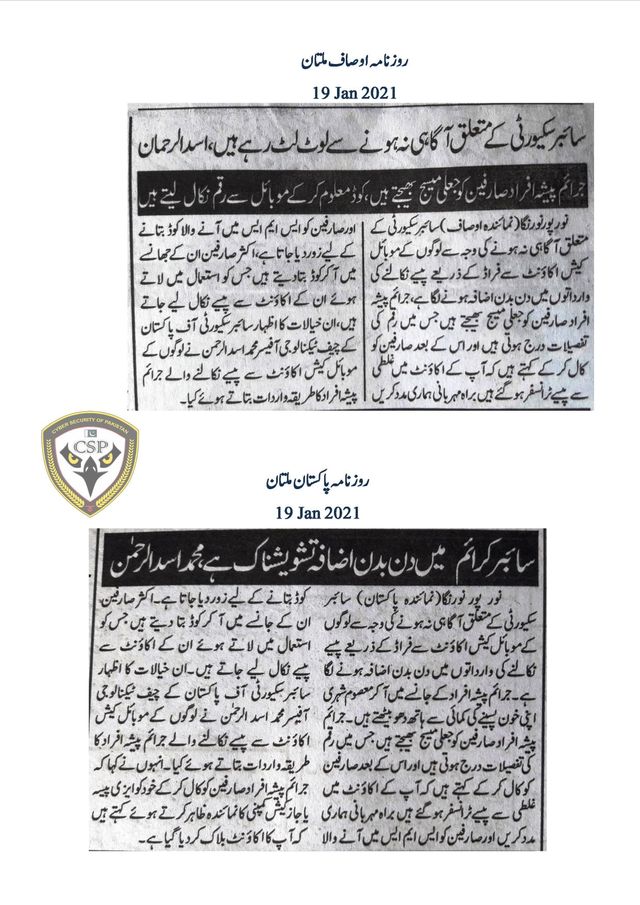 سائبر سکیورٹی کے متعلق آگاہی نہ ہونے کی وجہ سے لوگوں کے موبائل کیش اکاؤنٹ سے فراڈ کے ذریعے پیسے نکالنے کی وارداتوں میں دن بدن اضافہ ہونے لگا ہے۔ جرائم پیشہ افراد کے جانسے میں آ کر معصوم شہری اپنی خون پسینے کی کمائی سے ہاتھ دھو بیٹھتے ہیں۔جرائم پیشہ افراد صارفین کو جعلی میسج بھیجتے ہیں جس میں رقم کی تفصیلات درج ہوتی ہیں اور اس کے بعد صارفین کو کال کر کے کہتے ہیں کہ آپ کے اکاؤنٹ میں غلطی سے پیسے ٹرانسفر ہو گئے ہیں براہ مہربانی ہماری مدد کریں اورصارفین کو ایس ایم ایس میں آنے والا کوڈ بتانے کے لیے زور دیا جاتا ہے۔اکثر صارفین ان کے جانسے میں آ کر کوڈ بتا دیتے ہیں جس کو استعمال میں لاتے ہوئے ان کے اکاؤنٹ سے پیسے نکال لیے جاتے ہیں۔ان خیالات کا اظہار سائبر سکیورٹی آف پاکستان کے چیف ٹیکنالوجی آفیسر محمد اسد الرحمن نے لوگوں کے موبائل کیش اکاؤنٹ سے پیسے نکالنے والے جرائم پیشہ افراد کا طریقہ واردات بتاتے ہوئے کیا۔