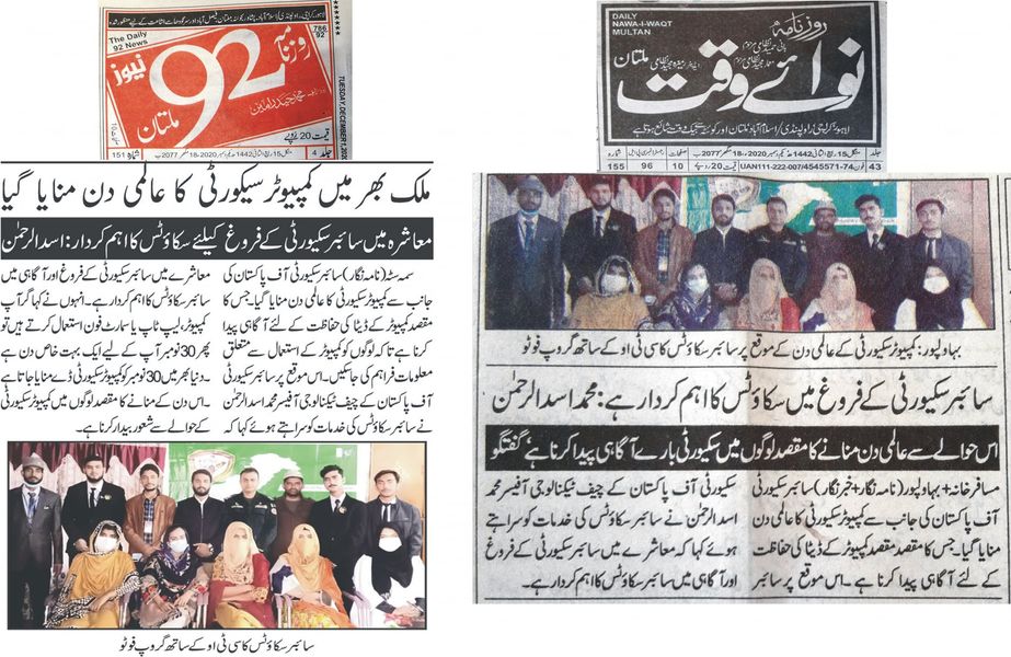 Cyber Security of Pakistan celebrated World Computer Security Day with the aim of raising awareness about the protection of computer data and providing people with essential information on safe computer usage. On this occasion Cyber Security Expert of Cyber Security of Pakistan Muhammad Asad Ul Rehman, praised the services of the Cyber Scouts, emphasizing their crucial role in promoting cyber security and awareness within society.